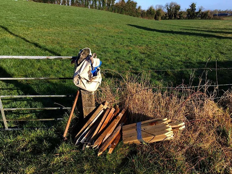 The 50 setting-out timber stakes with a large sledgehammer to knock them into the stiff clay ground!